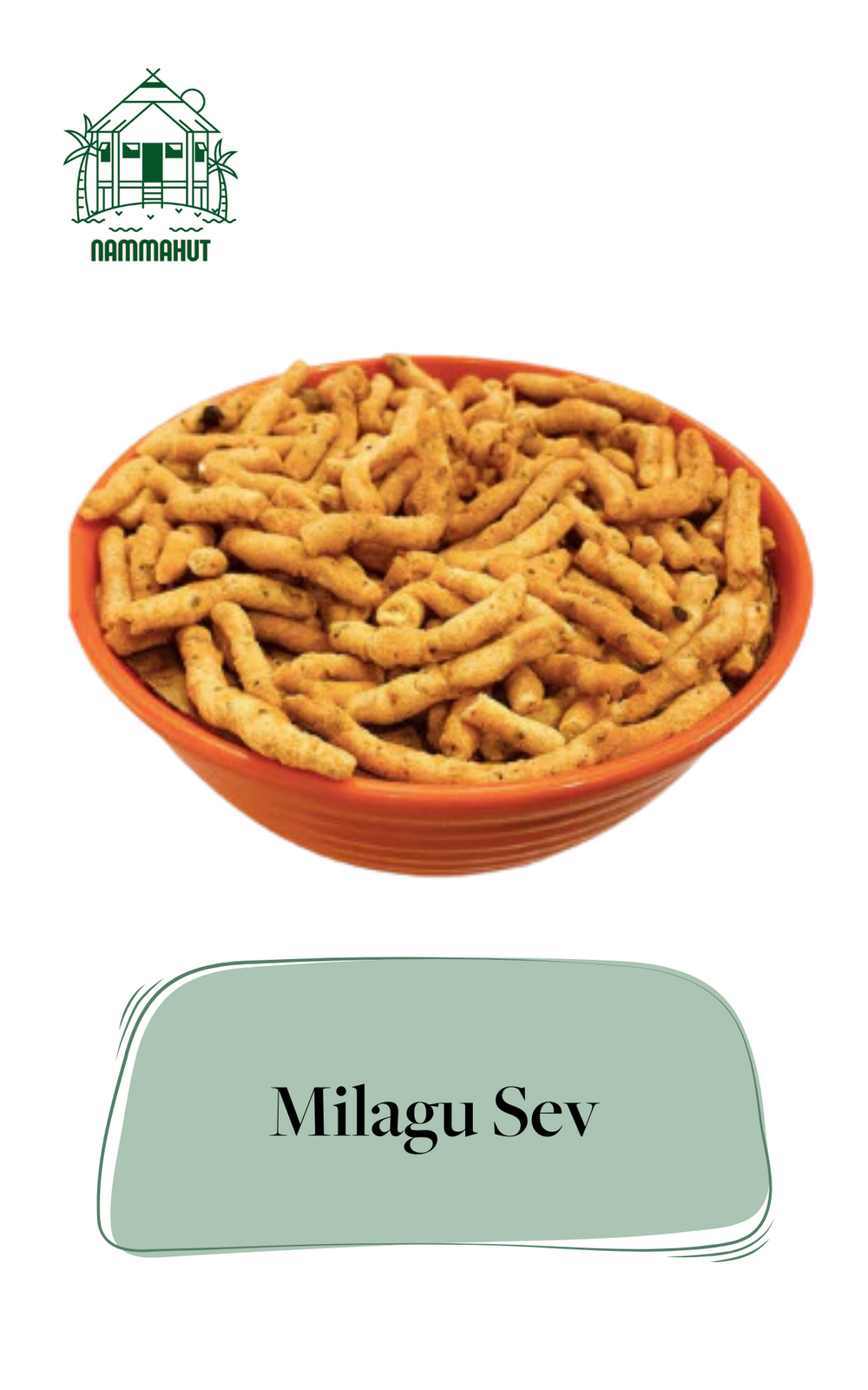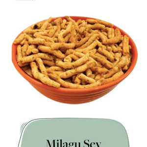 Milagu Sev is made from a mixture of besan (gram flour), rice flour, black pepper (milagu), cumin seeds, asafoetida, and other spices. These ingredients are combined to form a dough-like consistency. The dough is then passed through a special gadget called a "sev press" or "sev maker," which has different-sized plates to create thin, noodle-like strands. These strands are deep-fried until they become golden brown and crispy.